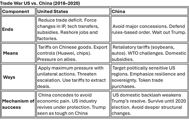 To further illustrate the usefulness of the framework, I transcribed US-China trade war of 2018-2020 into the ends, means and way set up. See the Annex.