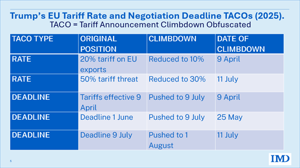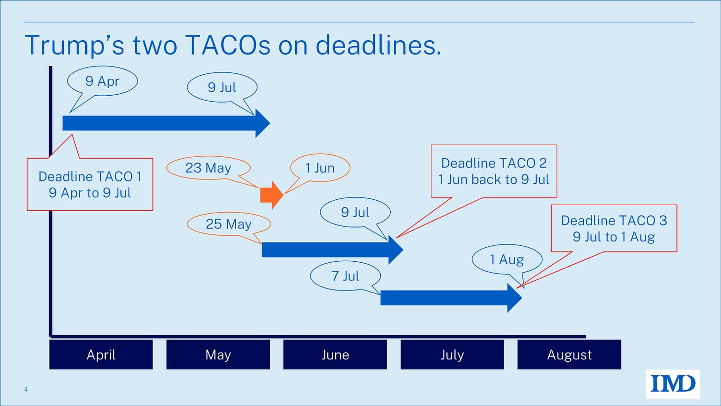 President Trump TACO’s on the rate, lowering the threat from 50% to 30%. President Trump TACO’s on the negotiation deadline, pushing it from 9 July to 1 August.