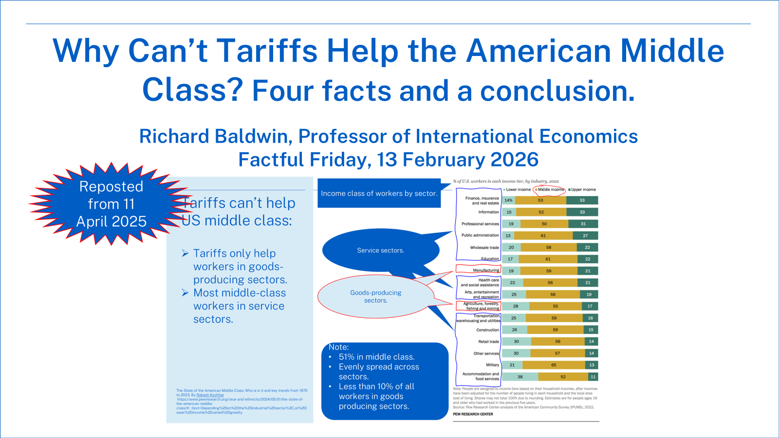 The distress of the American middle class isn’t primarily due to trade or globalization alone. Rather, it is the result of structural economic shocks—a combination of rapid globalisation (especially industrial offshoring) and robotics, which I call the “globotics shocks” in Baldwin (2019).