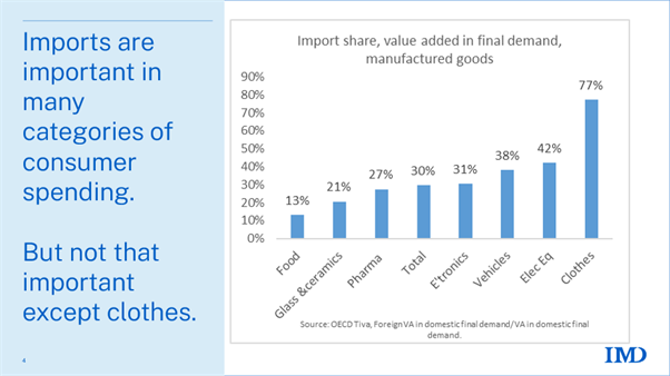 3. As the chart below shows, apart from clothes and shoes, imports are not a huge share of the final consumer demand in the US (see point 1).