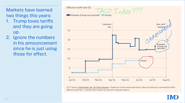 Markets hardly reacted because what happened this week was less bad than he promised in April. Moreover, the markets have got the hang of the TACO trade (see the chart), so it self-extinguished – as all arbitrages do once everyone knows about them. The shock announcement would have lowered markets as some investors bailed but the bulk of the market saw any softening as a buy-the-dip moment, and the market hardly moved.