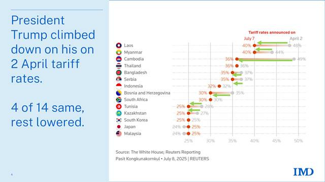 Without winning any concessions from any of the 21 nations, President Trump unilaterally climbed down on tariffs for 12 of them – announcing rates below the ones that he set in his 2 April Executive Order (see chart for the 7 April rates).